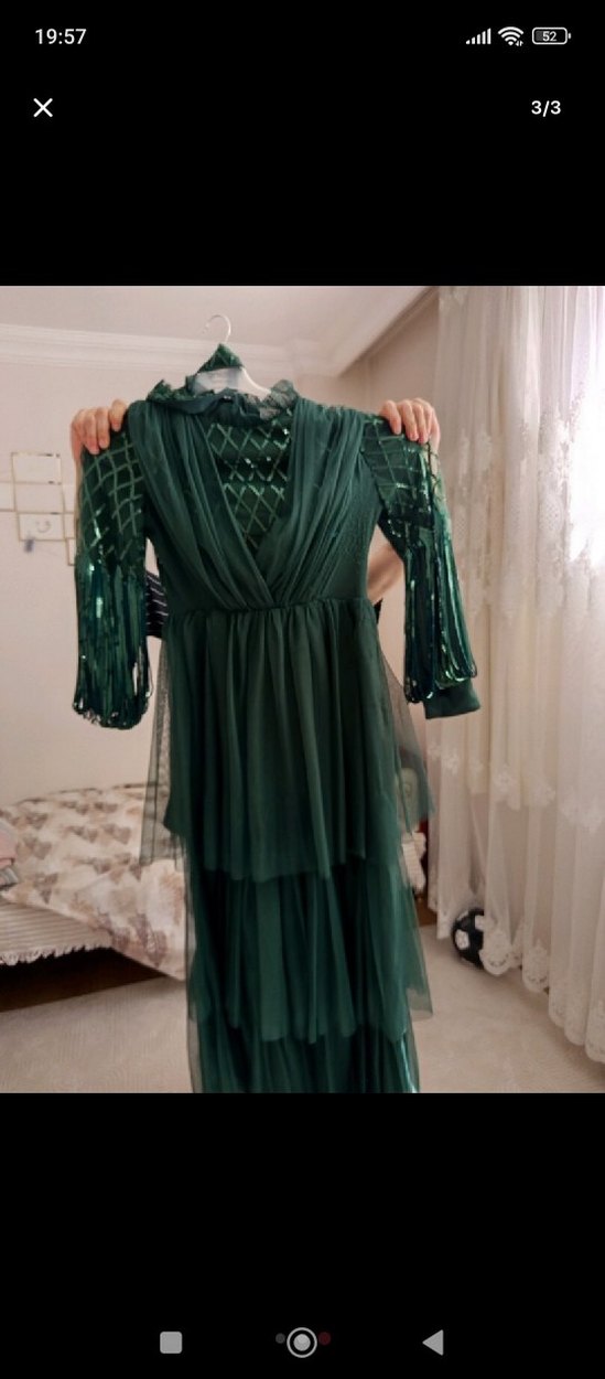 Koyu yeşil, uzun, v yaka ve uzun kollu bu elbise, drapeli ve desenli yapısıyla bohem ve avangard tarzı yansıtıyor. Fit kesim, özel davetler için uygun.