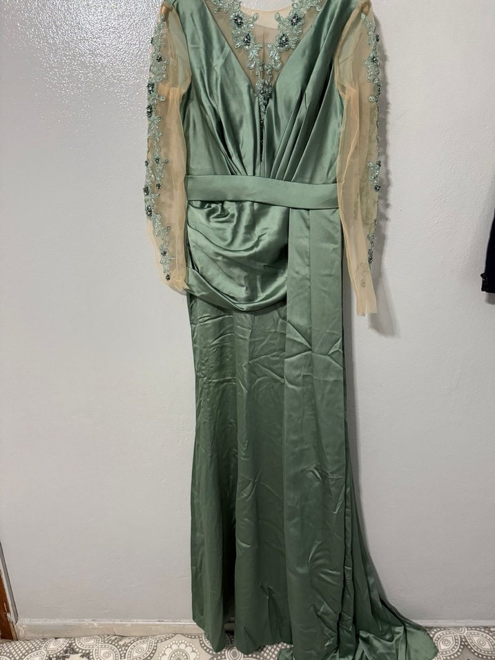 Drapeli tasarıma sahip uzun yeşil abiye elbise, çiçek işlemeli şeffaf uzun kollara sahiptir. Straplez yakalı ve klasik-vintage tarzda, düğünler için uygundur.