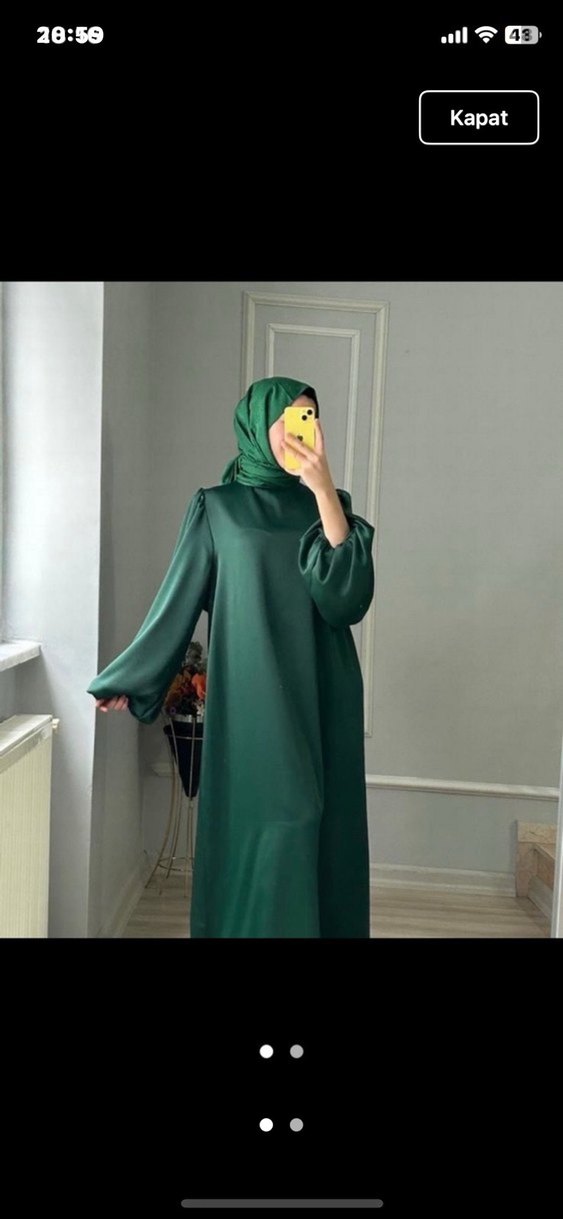 Drapeli, uzun kollu, yüksek yakalı ve bol kesimli yeşil elbise, ipeksi kumaştan sade ve mütevazı bir stil sunar. Zara model