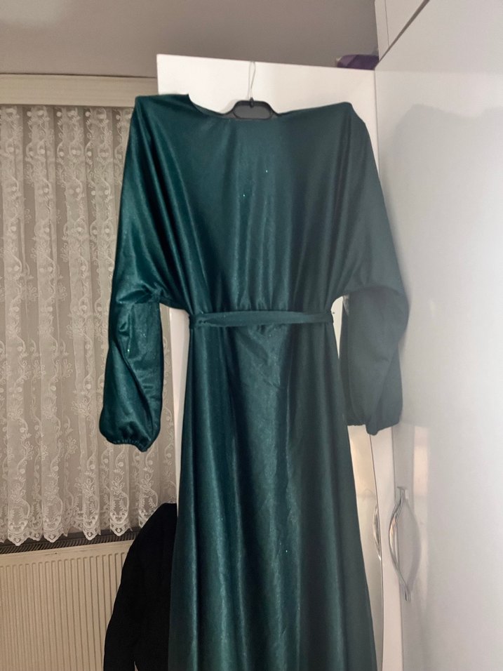 Uzun, koyu yeşil renkli kadın gece elbisesi, drapeli tasarım, V yakalı ve uzun kolludur. Gevşek ve sade bir kesime sahiptir. Simli