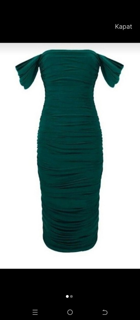 Drapeli ve uzun yeşil kalem elbise, tekne yaka ve askılı kollarla modern klasik bir tarz sunar. Cesur ve göz alıcıdır.