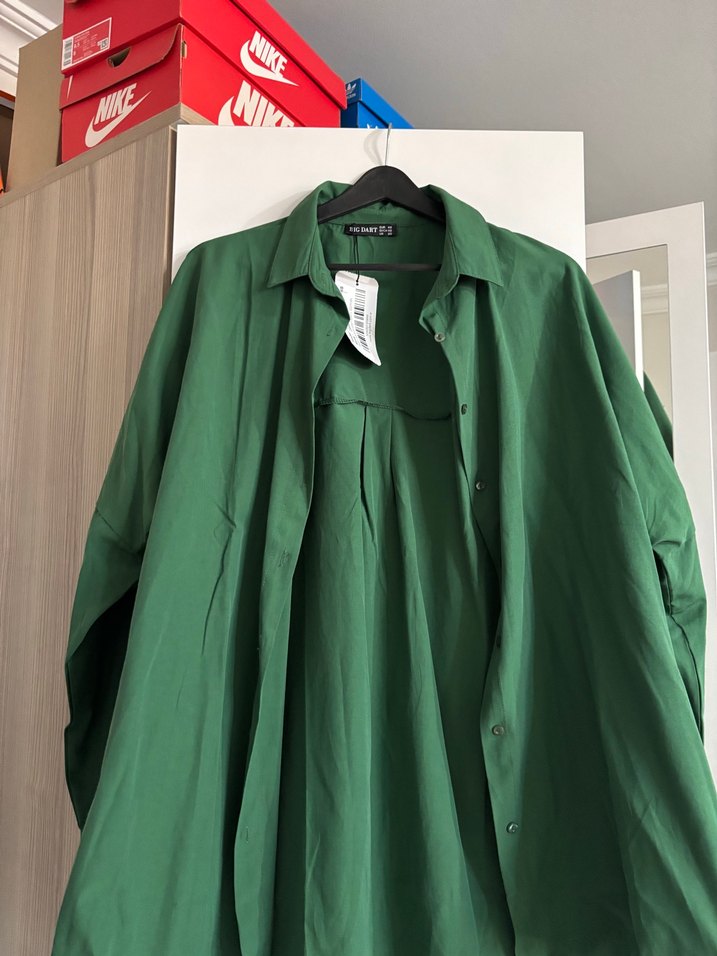 Drapeli, uzun yeşil keten gömlek, notched lapel yaka ve uzun kollu. Sokak stili için uygun, rahat kesim bir model.