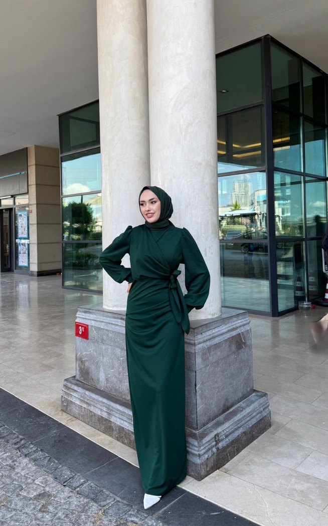 Yüksek yakalı, uzun kollu, drapeli detaylı uzun yeşil tesettür elbise. Etiketli ve paketlidir xl bedendir esnektir