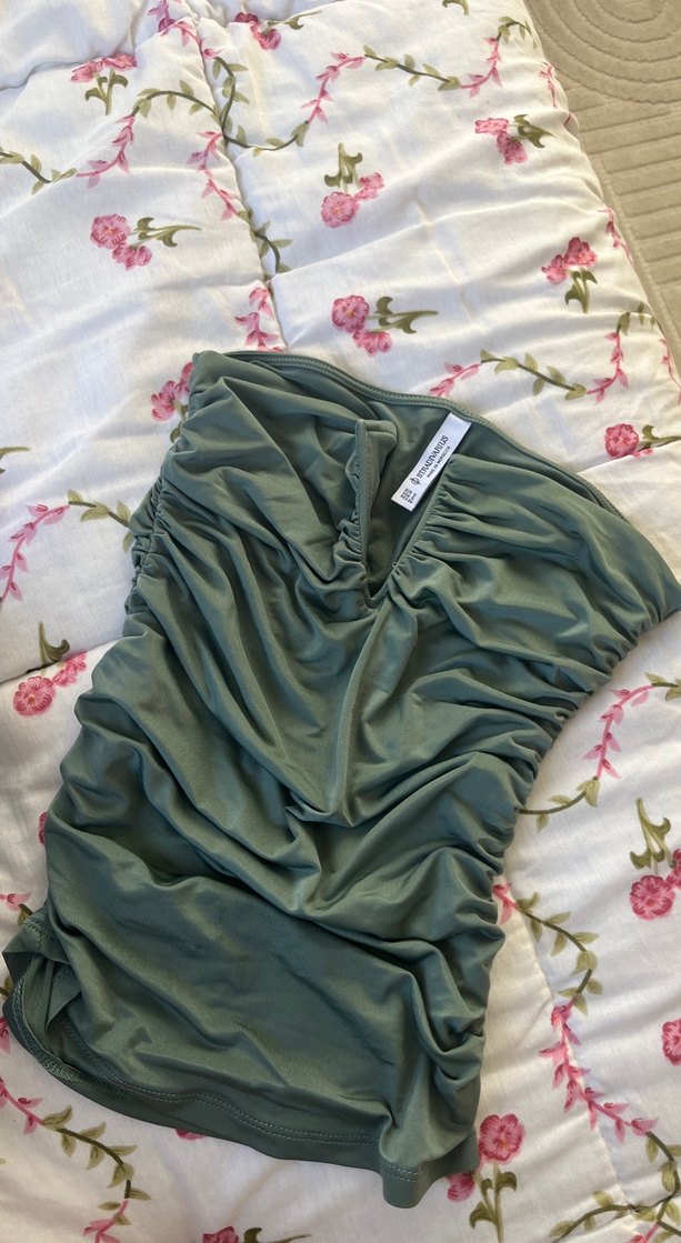 Pastel haki renkte, drapeli ve vücuda oturan v dekolteli Stradivarius S beden bluz