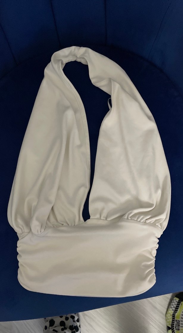 Beyaz hamile bluzu, drapeli tasarımı, V yaka ve dar kesimi ile dikkat çeker. Kolsuz ve yumuşak sentetik kumaştan, günlük kullanıma uygun minimalist tarzda.