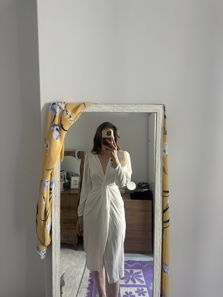 Uzun kollu, drapeli ve V yakalı beyaz midi elbise, ince kesimi ve ipeksi dokusuyla şık sokak modası ve düğünler için uygun.