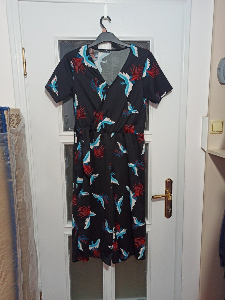 Koyu gri renkte, drapeli ve desenli hamile tulumu. V yaka, kısa kollu ve rahat kesimlidir, günlük kullanım için uygundur.