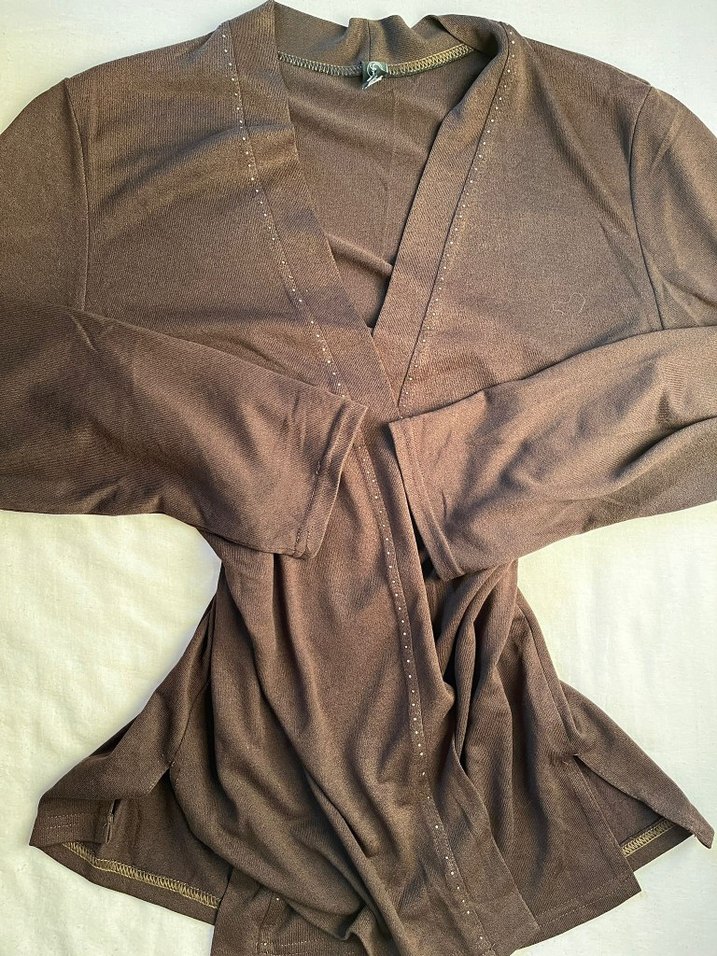 Drapeli, V yakalı, uzun kollu ve kahverengi hamile hırka. Yumuşak, normal midi boyunda, günlük kullanıma uygun.