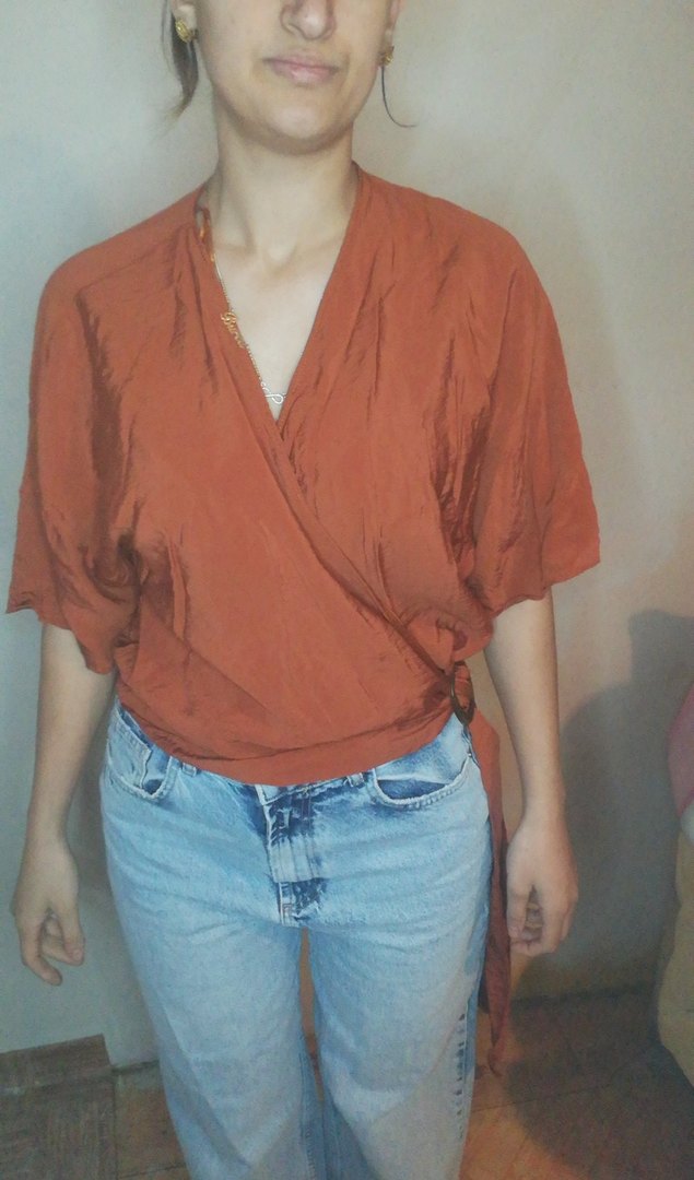 Kahverengi, drapeli ve V yakalı, ipeksi parlak kumaştan yapılmış bol kesim bluz. Kısa kollu ve midi boyda, günlük sokak tarzı için uygundur. ✨