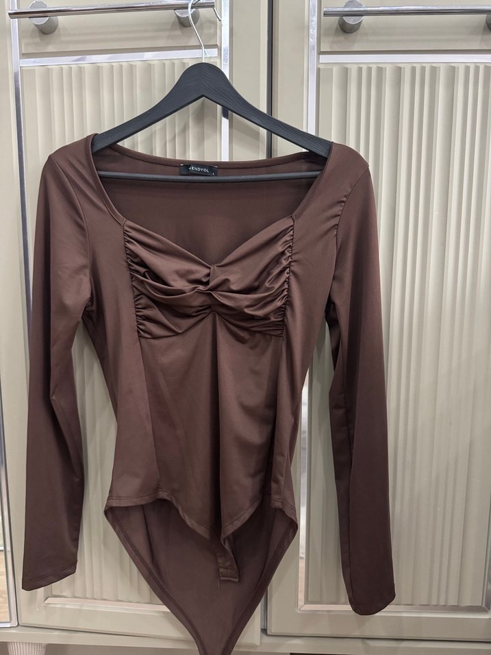 Kahverengi, drapeli tasarıma sahip, V yakalı ve uzun kollu, vücuda oturan bluz. Normal boyda, sentetik kumaştan üretilmiştir.