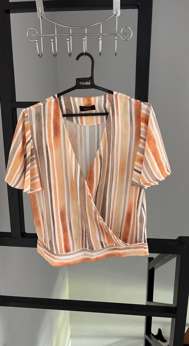 Drapeli, V yakalı, kısa kollu, bej-gri taba çizgili desenli, sentetik kumaştan yapılmış salaş kesim kadın bluz. Günlük kullanıma uygun.36 ve 38 beden de giyebilir