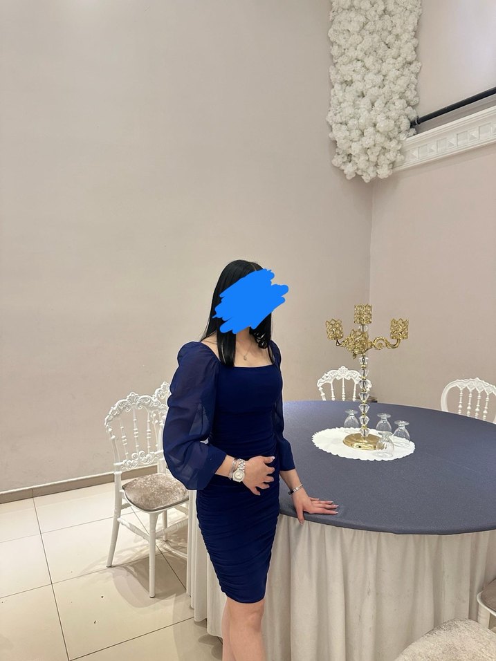 Drapeli uzun kollu, V yakalı, lacivert midi elbise. Sentetik kumaştan yapılmış, sade ve ofis stiline uygun bir tasarım.