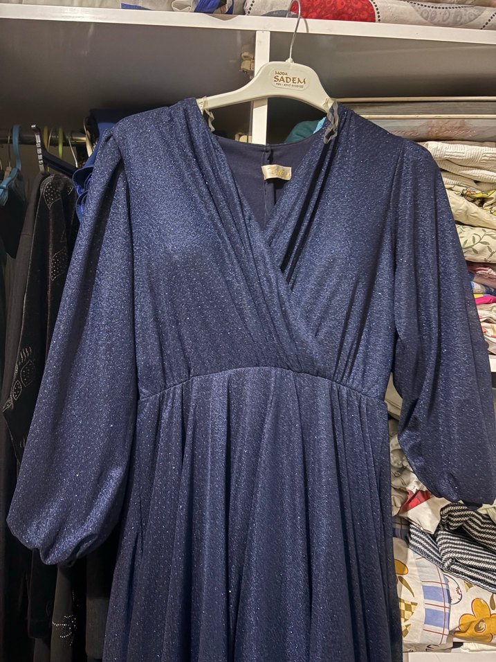 Lacivert uzun elbise, drapeli V yaka ve bol kesim uzun kollu tasarımıyla simleri ile prenses gib hissedeceksiniz kemeri malesef kayboldu beli lastiklidir 48 bedene kadar olur