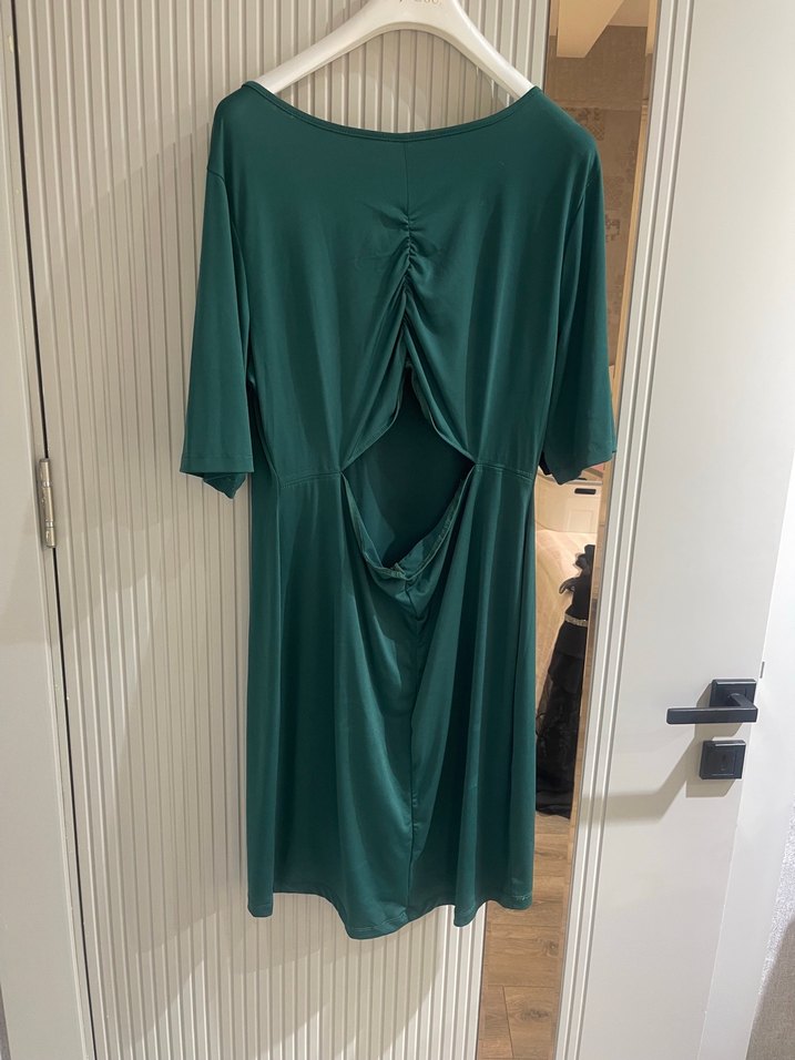 Drapeli ve V yakalı, kısa kollu, normal boy midi elbise. Sentetik kumaştan yapılmış, koyu yeşil renkte minimal ve çağdaş tasarımıyla romantik akşamlar için uygun.