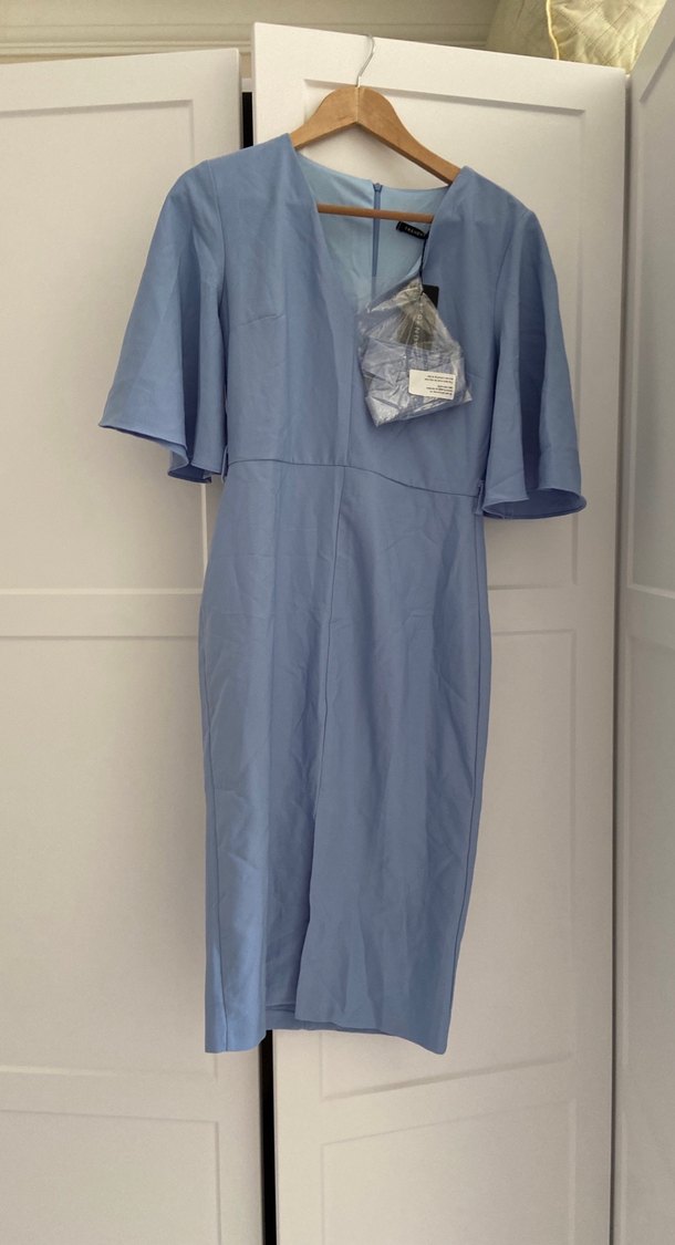 V yaka ve kısa drapeli kollara sahip, iş ortamına uygun mavi midi elbise.