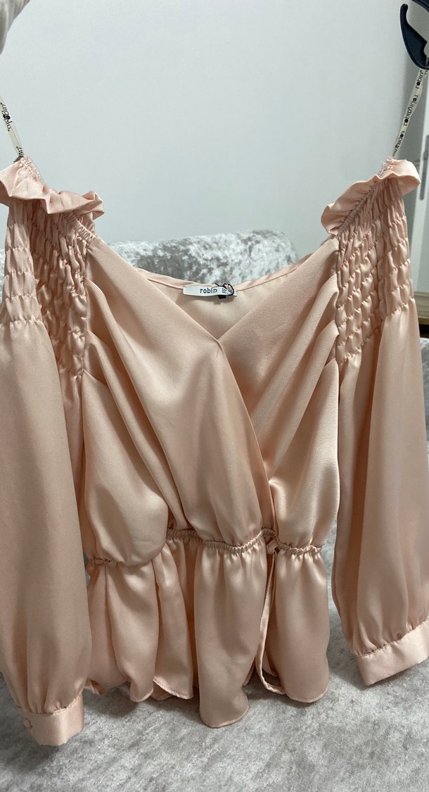 Pudra renkli, saten dokulu, drapeli V yaka ve askılı kollara sahip, bol kesim ve parlak görünümlü bluz. Günlük kullanıma uygun, bohem tarzda.