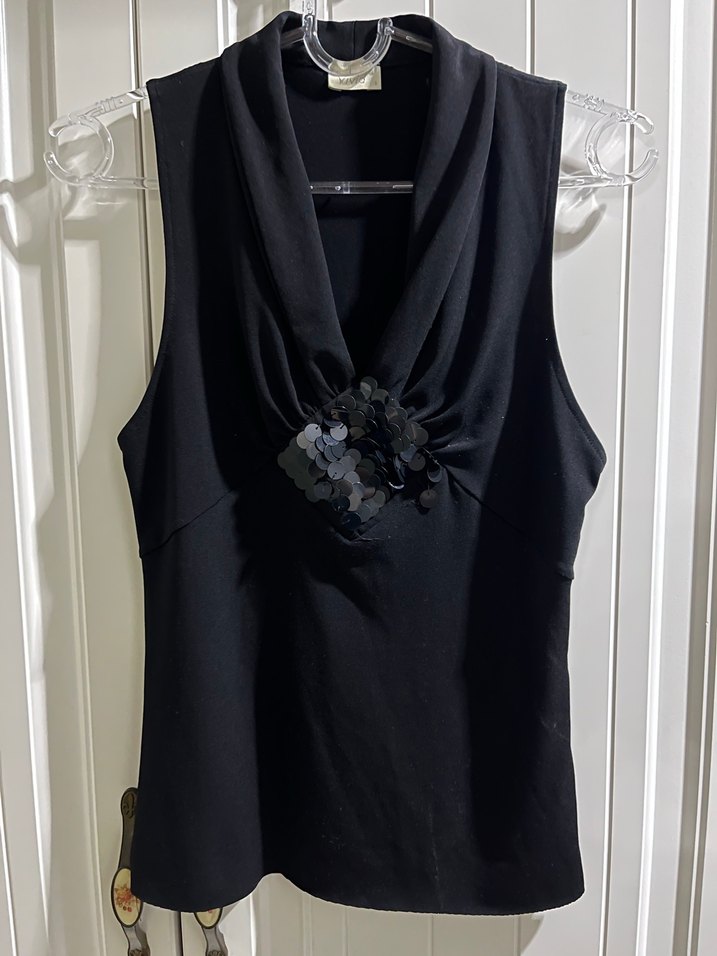 Drapeli V yakalı, siyah kolsuz ve oturan kesim bluz. Ortasında pul detaylı, yumuşak sentetik kumaştan üretilmiştir. Ofis için uygundur. Çok belli olmayan hafif bir defosu var.