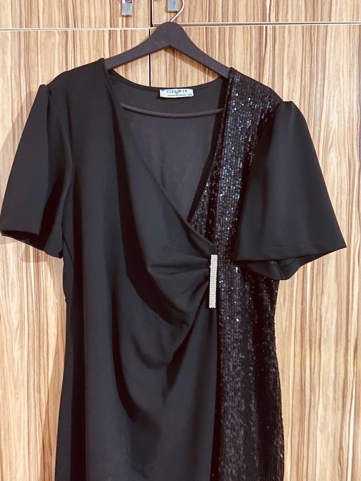 Siyah mini elbise, V yakalı ve drapeli detaylıdır. Kısa kollu, rahat kesimdir ve parlak desenli paneliyle şıklık sunar. Romantik akşamlar için uygundur.