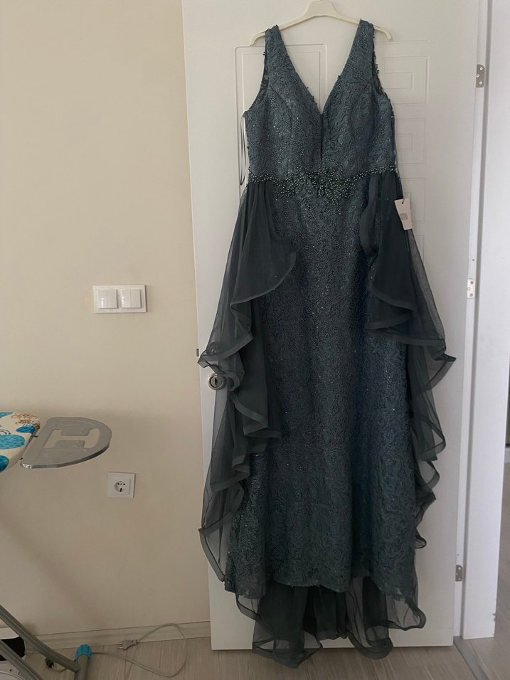 V yaka, kolsuz, , desenli yeşil kumaştan büyük beden uzun abiye elbise, sıfır hiç kullanılmadı