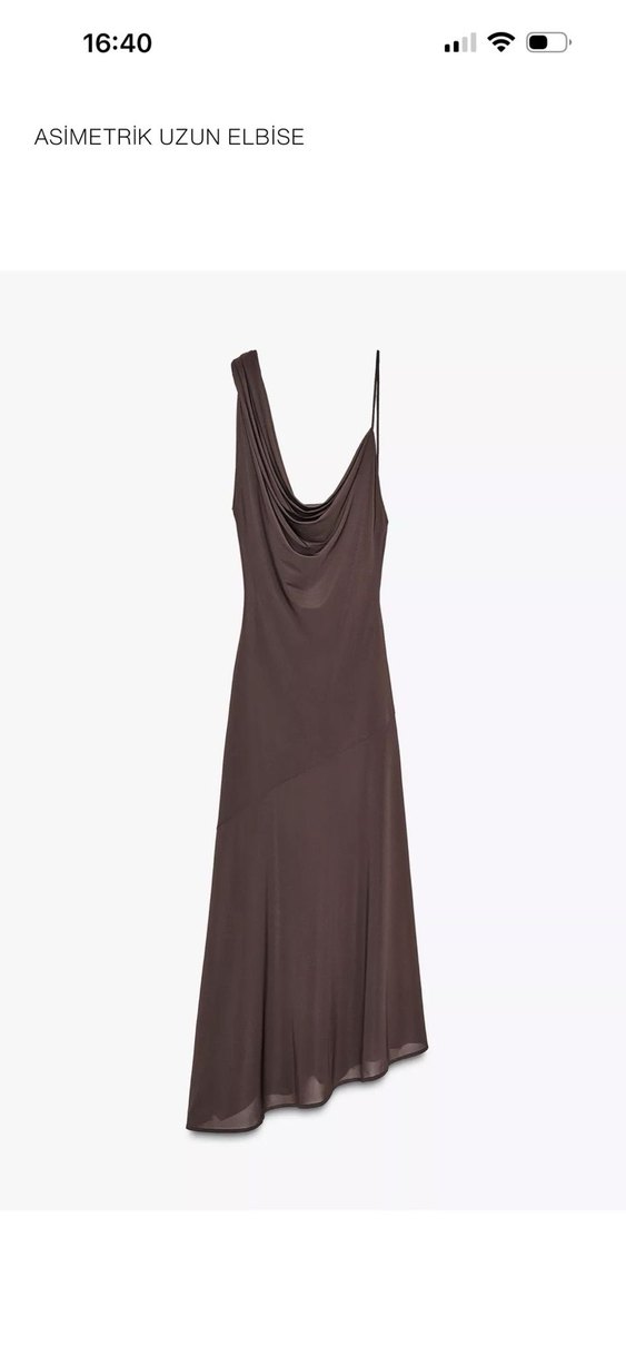 Drapeli V yaka, kolsuz, uzun ve kahverengi tonlarında, ipeksi dokulu, fit kesim kadın elbisesi. Minimalist ve çağdaş tarz sunar, romantik akşamlar için uygun.