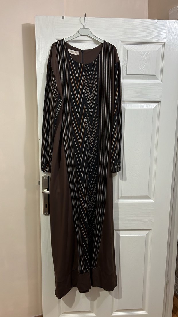 Uzun, regular fit kadın elbise, drapeli desenli ön yüz ve uzun kollara sahiptir. Sentetik kumaştan yapılmış, koyu kahverengi renkte ve V yakalıdır, ofis için uygundur.