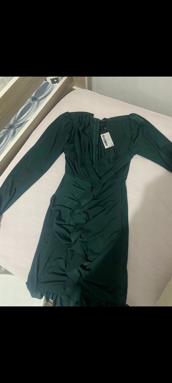 Drapeli, V yakalı ve uzun kollu, fit kesim koyu yeşil abiye elbise, Trendyol elbise 34 beden hiç giyilmemiş etiketli