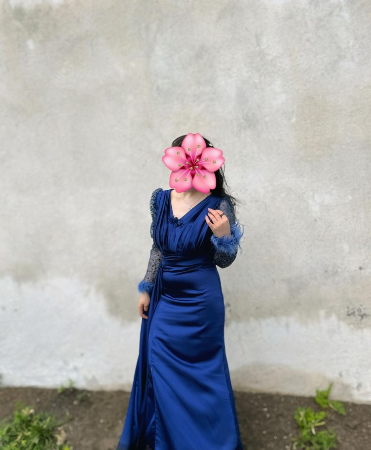Drapeli V Yaka Uzun Mavi Kadın Abiye