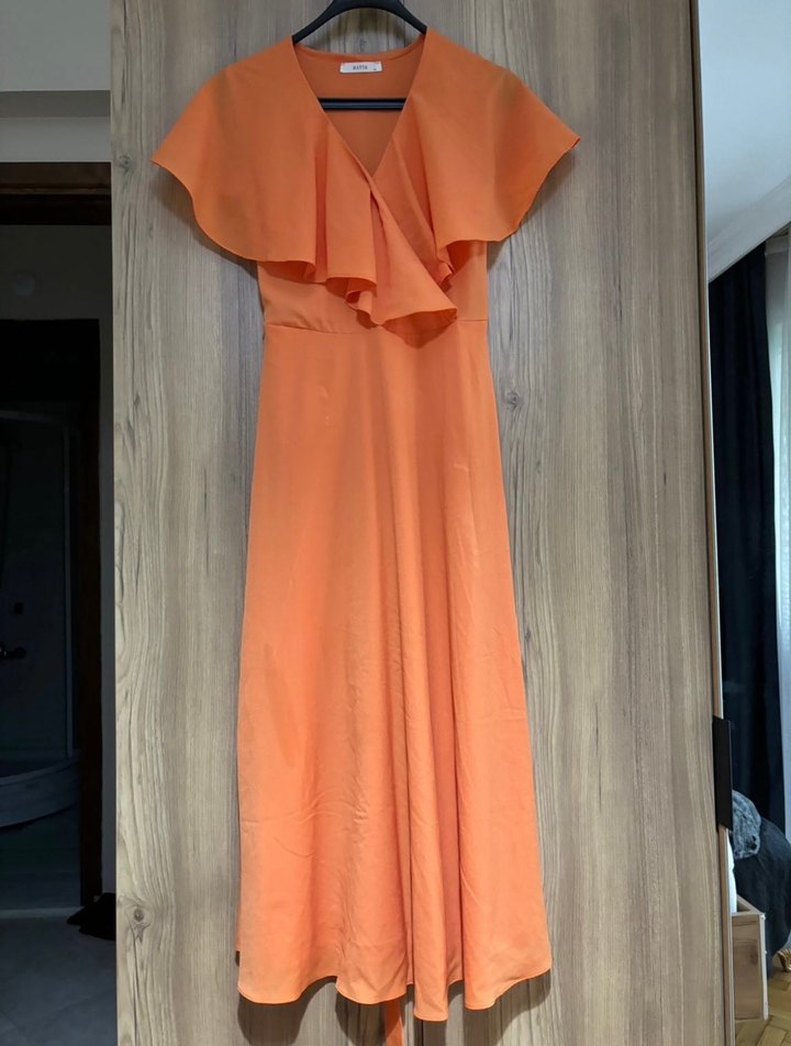Kolsuz, V yakalı, drapeli uzun elbise. Yumuşak sentetik kumaştan, bol kesim, canlı turuncu renkte, bohem tarzda.