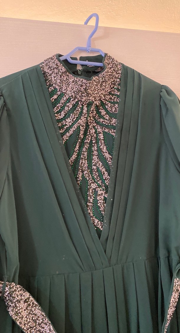 Drapeli ve V yakalı bu yeşil uzun elbise, parlak işlemeler ve uzun kollara sahiptir. Salaş kesimiyle düğünler için uygundur. ✨