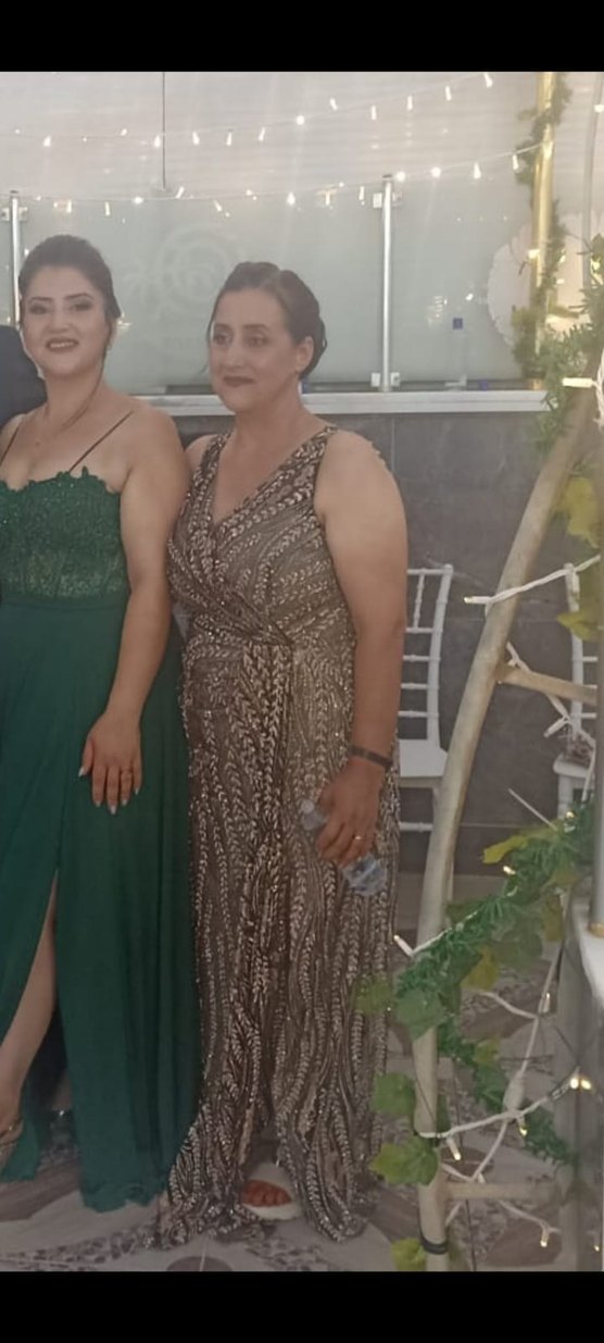 Drapeli tasarıma sahip, yılan desenli parlak kahverengi uzun abiye. V yaka ve ince askılı kollu, klasik ve bohem şıklığı yansıtıyor.