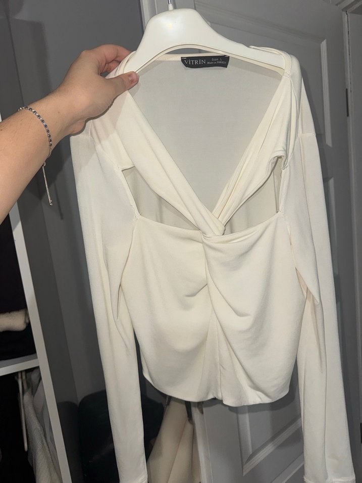 Beyaz uzun kollu, v yakalı, drapeli ve dar kesim kadın bluz. Pürüzsüz sentetik kumaştan, minimal ve şık bir tarz sunar.