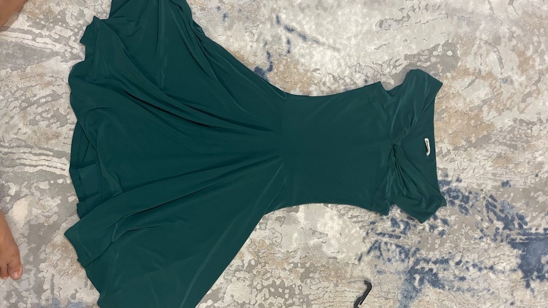 Drapeli, V yakalı, kolsuz, uzun ve vücuda oturan kadın elbisesi. Koyu yeşil renk ve çağdaş tarzıyla dış mekan etkinliklerine uygundur.