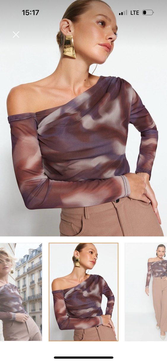 Bu kahverengi batik bluz, drapeli tasarımı, V yaka ve uzun kollara sahiptir. Rahat kesim ve kısa boy, sentetik kumaştan yapılmıştır, günlük kullanıma uygundur.