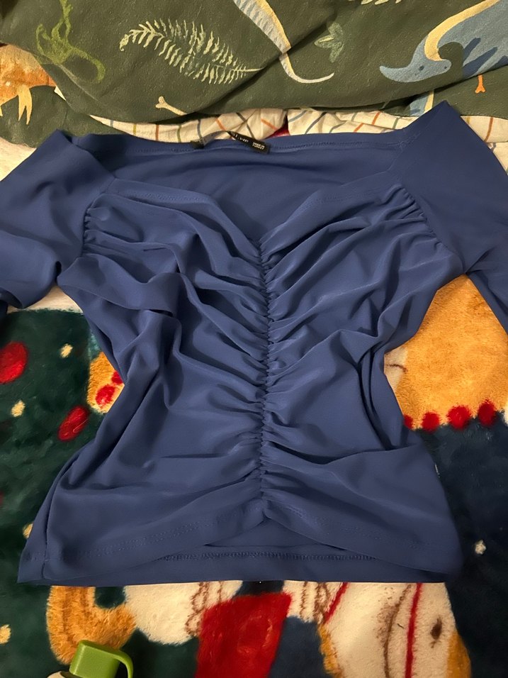 Drapeli, V yakalı, kısa kollu, koyu mavi renkli, normal uzunlukta, sentetik kumaştan kadın bluz. Avant-garde sokak modasına uygun, parti için ideal.