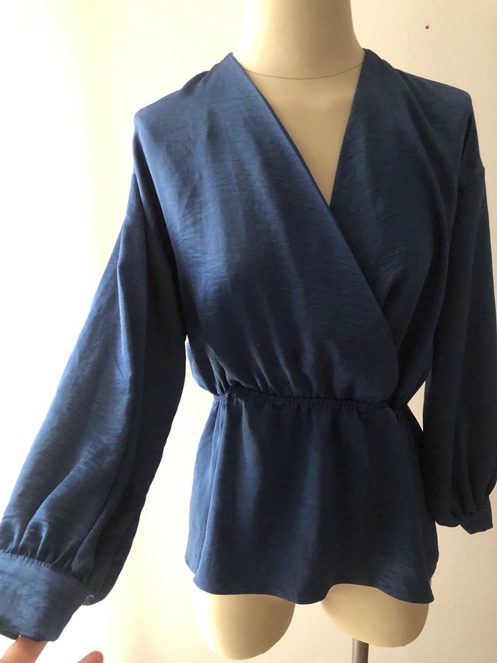 Lacivert, ipeksi dokulu, drapeli V yakalı, uzun kollu, midi boy ve bol kesim kadın bluz. Ofis için çağdaş Paris tarzında uygun.