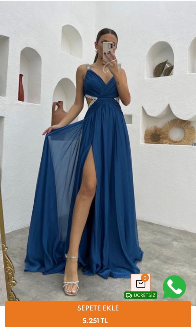 Drapeli tasarımı, V yakası ve askılı kollarıyla fitted lacivert abiye. Parlak detaylara sahip, çağdaş tarzda, düğünler için uygun. Derin yırtmacı vardır iddialı bir elbise bel göğüs dekoltesi vardır çok şık duryor rengi parlıament mavisi. Sadece 1 kere düğün için giydim. Pazarlık payı vardır