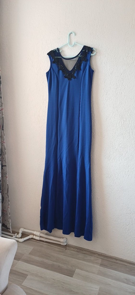 Lacivert renkte, drapeli ve V yakalı, kolsuz, uzun ve dar kesim balık abiye elbise, düğünler için uygundur.