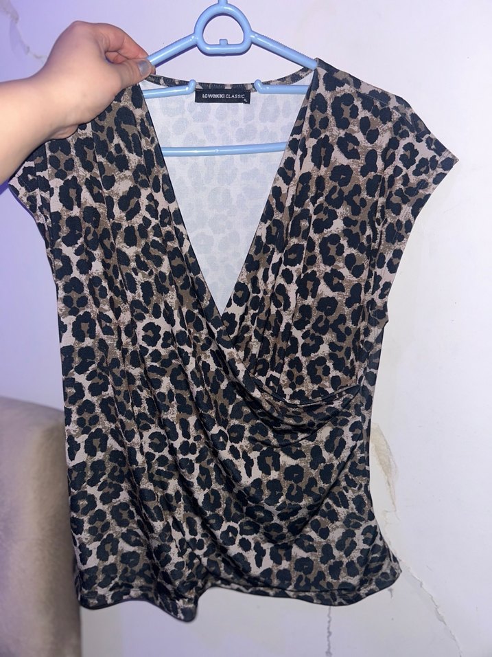 Drapeli V yakalı, leopar desenli, kolsuz ve vücuda oturan kahverengi kadın bluz. Yumuşak sentetik kumaştan üretilmiştir.
