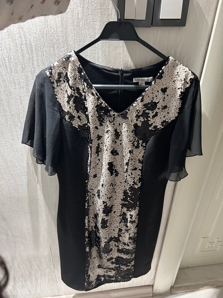 V yakalı, kısa drapeli kollu, siyah midi elbise. Ön kısmı parlak desenli, romantik akşamlar için uygun.