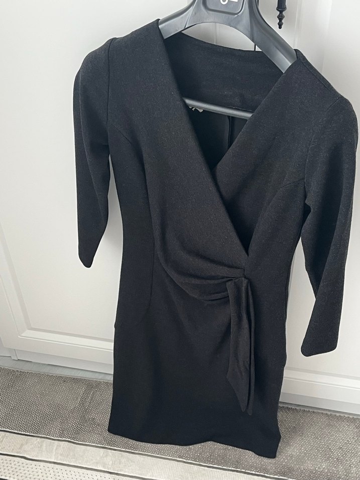 V yakalı, uzun kollu, drapeli siyah triko elbise. Midi boyda, ofis için uygun, gotik tarzda kesim.marka temsil