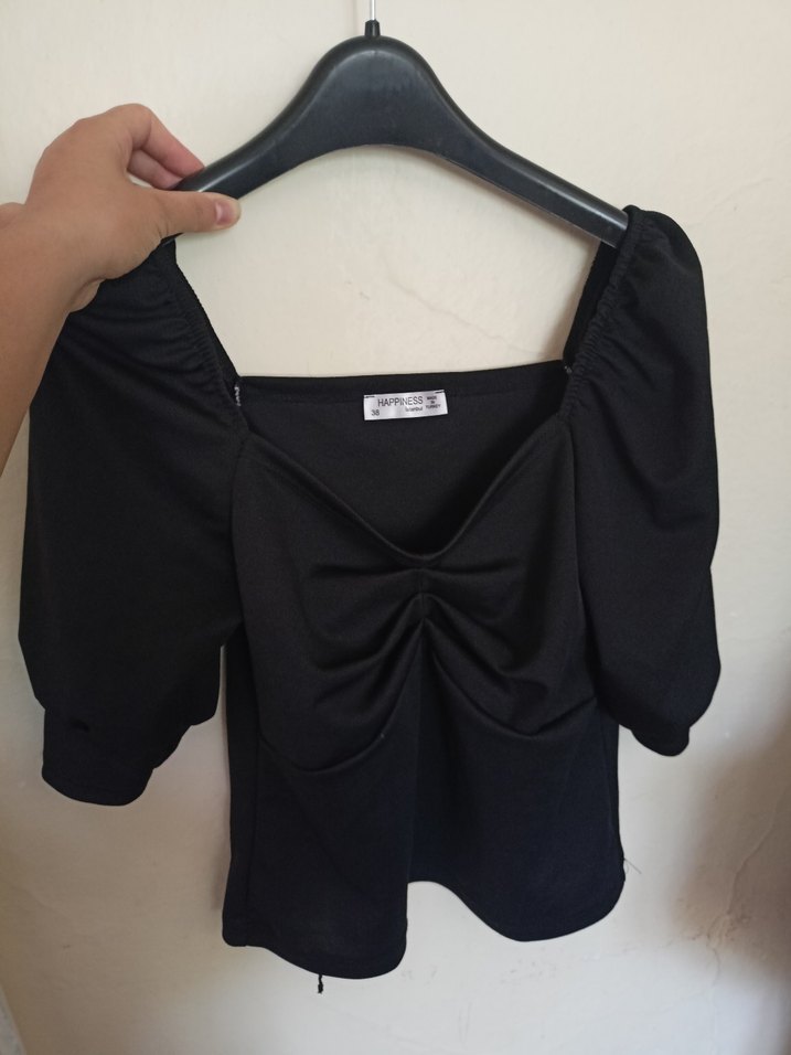 Drapeli tasarıma sahip, V yakalı ve kısa kollu siyah mini bluz, yumuşak sentetik kumaştan, günlük sokak stiline uygun.36 bedeni de mevcut.