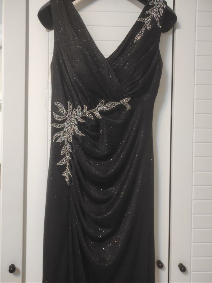 Drapeli ve V yakalı, kolsuz, siyah uzun abiye elbise. İnce baskılı deseni ve klasik şıklığı ile düğünler için uygun.