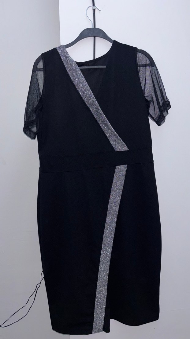 Siyah uzun elbise, V yakalı ve kısa tül kolludur. Drapeli tasarımda, gümüş renkli çapraz şerit bulunur. Ofis için moda goth tarzı sunar.