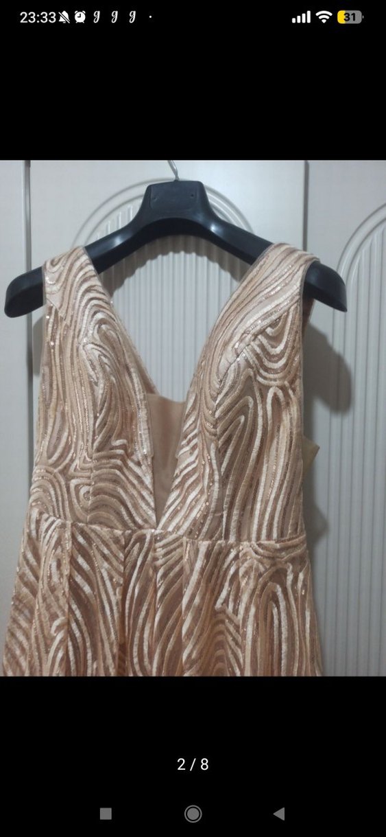 Kolsuz, v yakalı ve drapeli tasarıma sahip işlemeli parlak bej kumaftan yapılmıştır, parti için uygundur. Çok şık düğün için almıştım alfabeta dan M bedenine de L bedenine de rahat olur.Sadece topuğum takıldı bir kez giydim orda en alt kisimda hafif delik oluşmuş ama hiç belli olmuyor.✨ 9 bine almıştım çok uyguna koyuyorum.