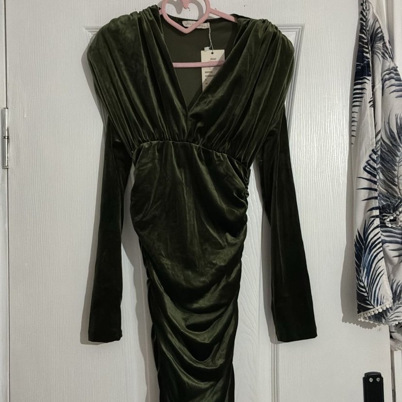 Drapeli, V yakalı, uzun kollu, dar kesim kadın abiye elbise. Koyu haki renkte, desensiz, romantik akşamlar için uygun.