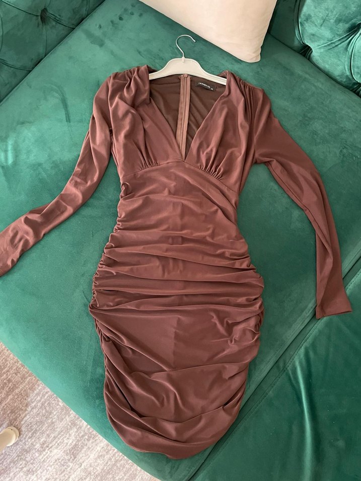 Drapeli V yakalı, uzun kollu, vücuda oturan kadın elbisesi. Uzun boyda, koyu bej renkte ve desensiz kumaştan, romantik akşamlar için uygundur.✨
