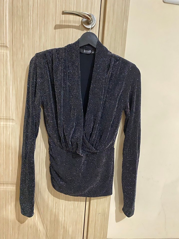 Drapeli V yakalı, uzun kollu ve fitted kesime sahip kadın bluzudur. Sentetik kumaştan yapılmış, siyah renkli ışıltılıdır. Davetlerde, düğün, nişan ve şık akşam yemeklerinde kullanılabilecek bir gece bluzudur