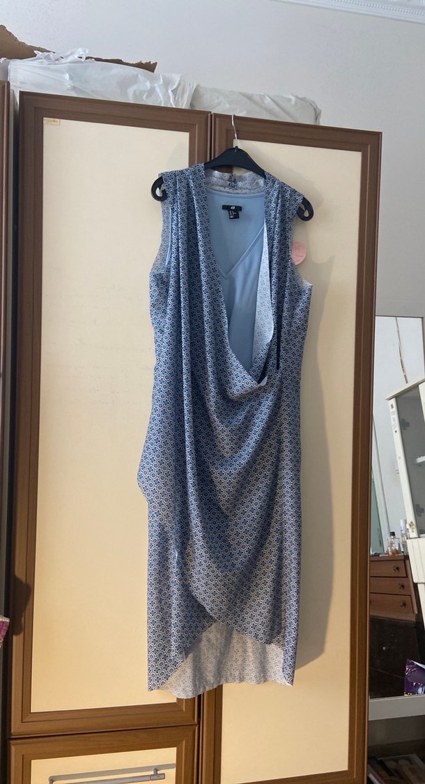 Kolsuz, drapeli ön detaylı, V yakalı ve uzun, ince mavi-gri batik desenli kadın elbisesi. Çağdaş tarz için uygun.