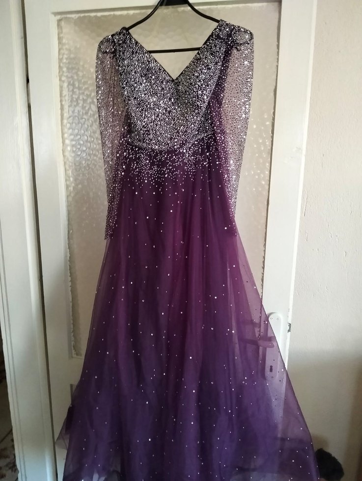 Drapeli tasarıma ve V yakaya sahip uzun mor abiye elbise, bol kesim ve ışıltılı detaylarla süslenmiş Kolları tül düğün nişan için uygun. ✨ S ve M bedene uygundur