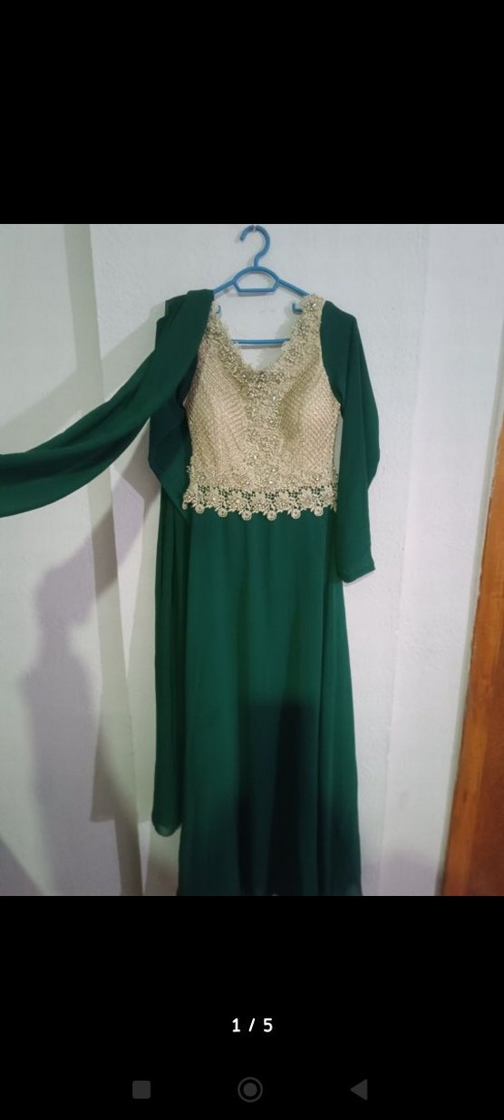 Drapeli ve V yakalı, uzun yeşil abiye elbise. Salaş kesimi ve parlak dokusuyla düğünler için klasik şıklık sunar.